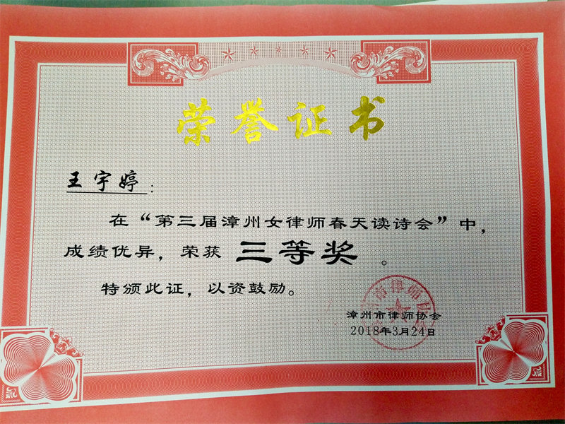王宇婷律师荣获“第三届漳州女律师春天读诗会”三等奖