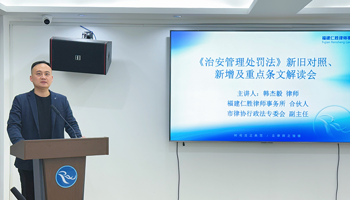 2025年12月25日下午,福建仁胜律师事务所开展专项业务学习活动,以“新旧《治安管理处罚法》对照及重点条文解读”为主题,由律所合伙人韩杰毅主讲,所内执业律师、实习律师参与本次学习活动。