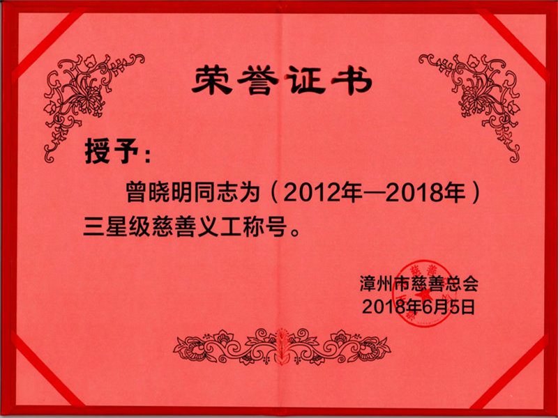 曾晓明律师荣获(2012年-2018年)三星级慈善义工称号