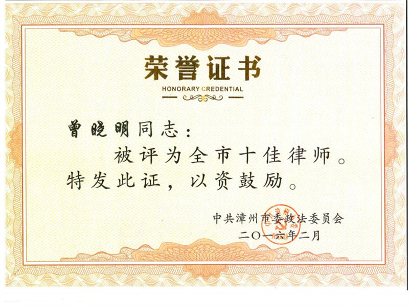 曾晓明律师荣获漳州市十佳律师