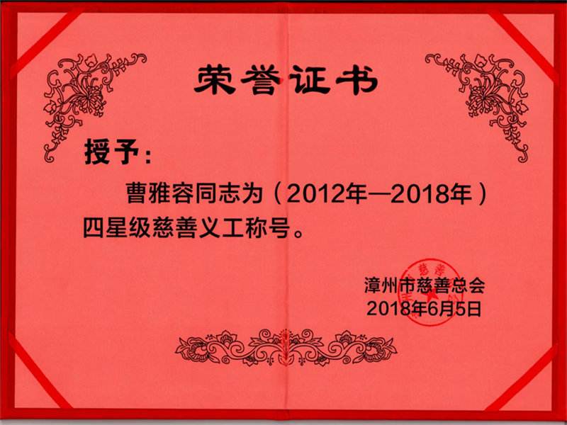 曹雅容律师荣获(2012年-2018年)四星级慈善义工称号