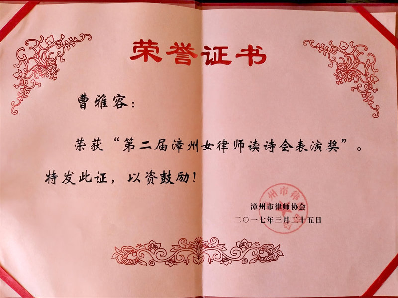 曹雅容律师荣获“第二届漳州女律师读诗会表演奖”