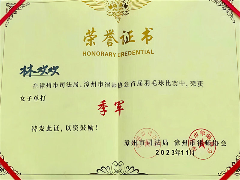 林欢欢律师荣获漳州市首届羽毛球比赛女子单打季军