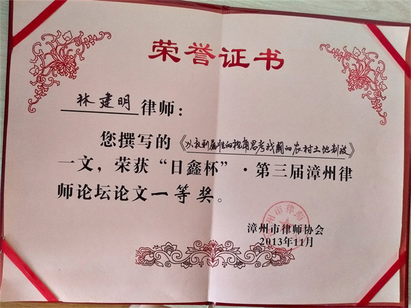 林建明律师获“日鑫杯”·第三届漳州律师论坛优秀论文一等奖