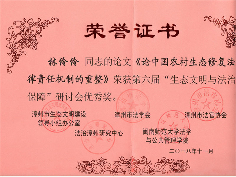 林伶伶律师荣获第六届“生态文明与法治保障”研讨会优秀奖