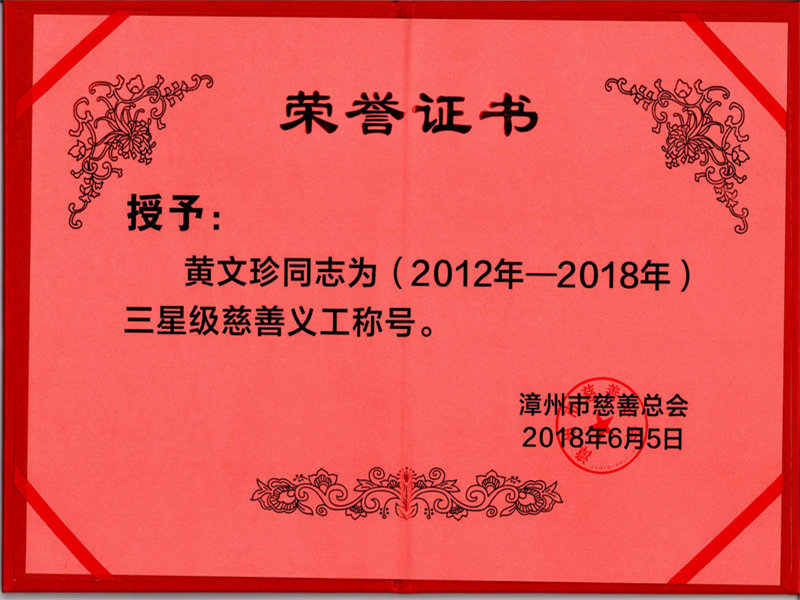 黄文珍律师荣获(2012年-2018年)三星级慈善义工称号