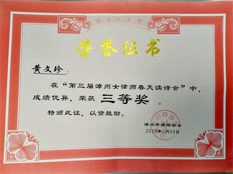 黄文珍律师荣获“第三届漳州女律师春天读诗会”三等奖