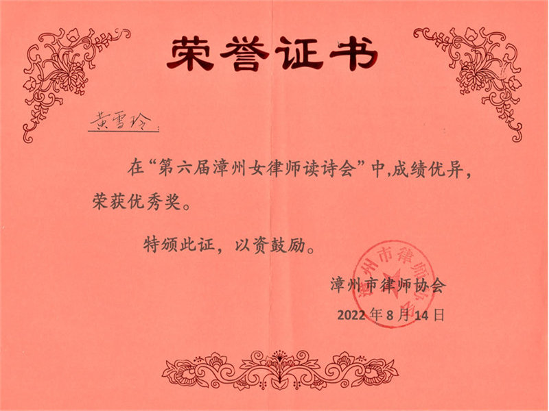 黄雪玲律师荣获“第六届漳州女律师读诗会”优秀奖
