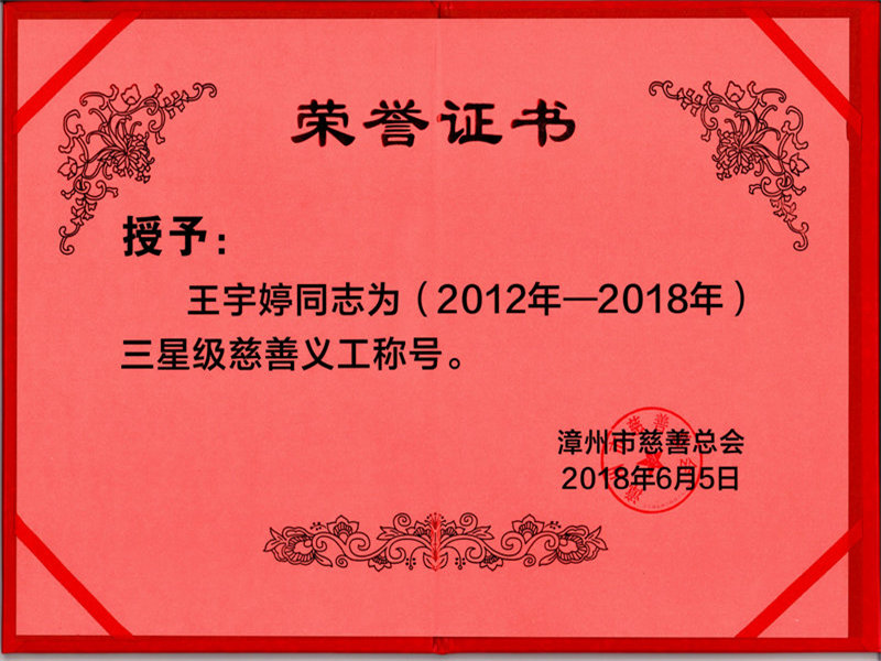 王宇婷律师荣获(2012年-2018年)三星级慈善义工称号