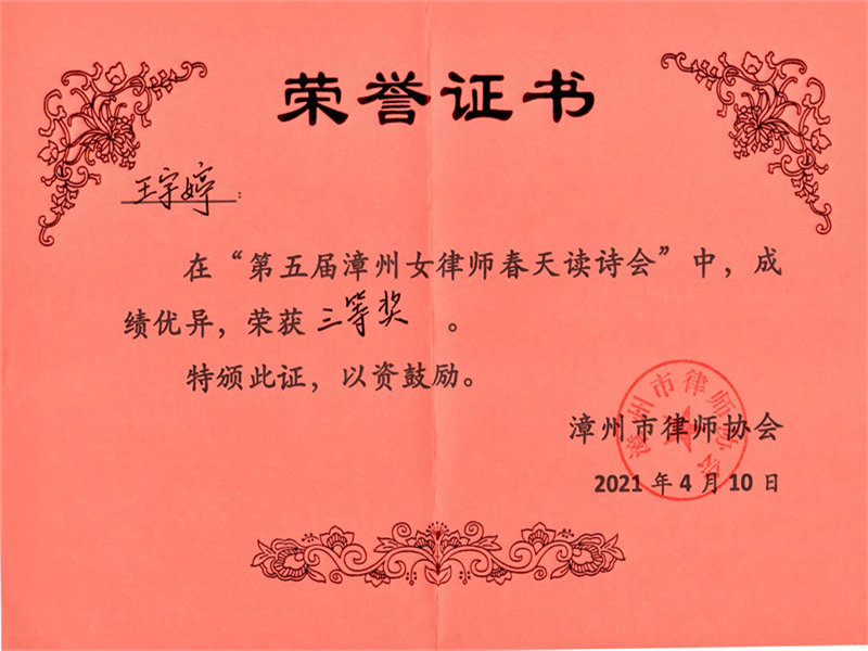 王宇婷律师荣获“第五届漳州女律师春天读诗会”三等奖